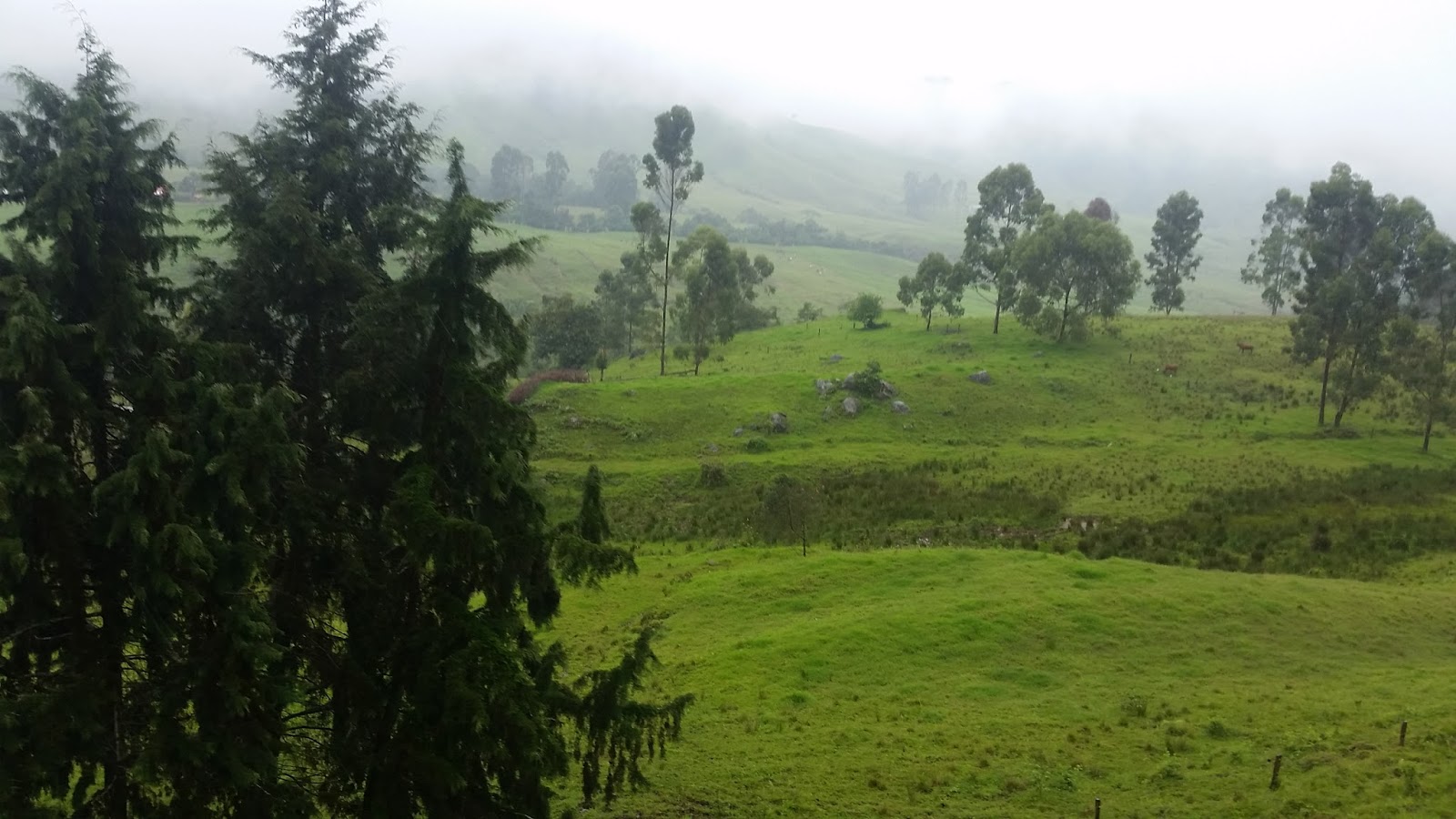 A la mañana siguiente fuimos a la terminal de nuevo a cover bus para un pueblito llamado Santa rosa (costó cerca de 3000 COP. El recorrido duró poco y el clima húmedo le hacía interesante. Me encantaba ya que veías a la gente mojarse muahahaha. La buseta nos dejó a unas cuadras del centro del pueblo, así que tuvimos que caminar pero entré al baño en una heladería antes de continuar. Sucede que en el centro no era donde se cogia el bus y había que caminar más, diagonal a la estación de policía. Tuvimos suerte al encontrar una chiva que subía hasta las termales. Lastimosamente no había un vehículo oficial bien adecuado, solo chivas y jeeps(aquel triste momento en que te da rabia no tener licencia ni coche a pesar de tener 23 años).